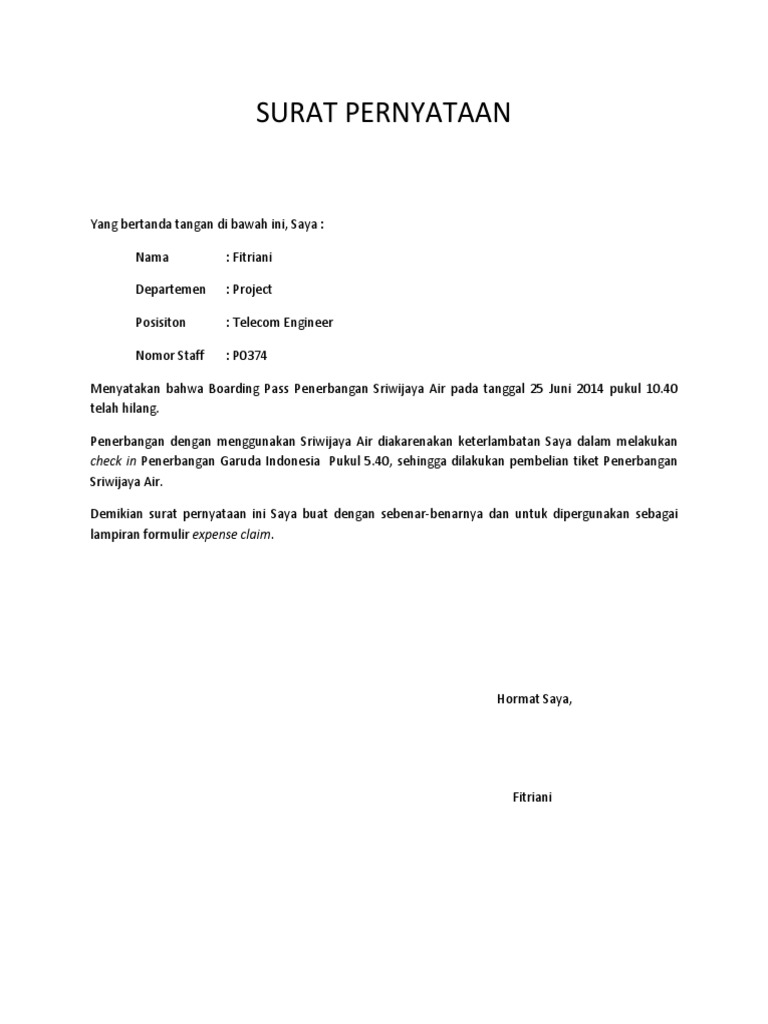 Contoh Surat Pernyataan Beli Tiket Pesawat